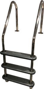 Escada com corrimão fabricado em ø43 e feito a partir de tubo de aço inoxidável, AISI-316L. Possui degraus de plástico de propileno que garantem um piso confortável e evita possíveis escorregões acidentais.